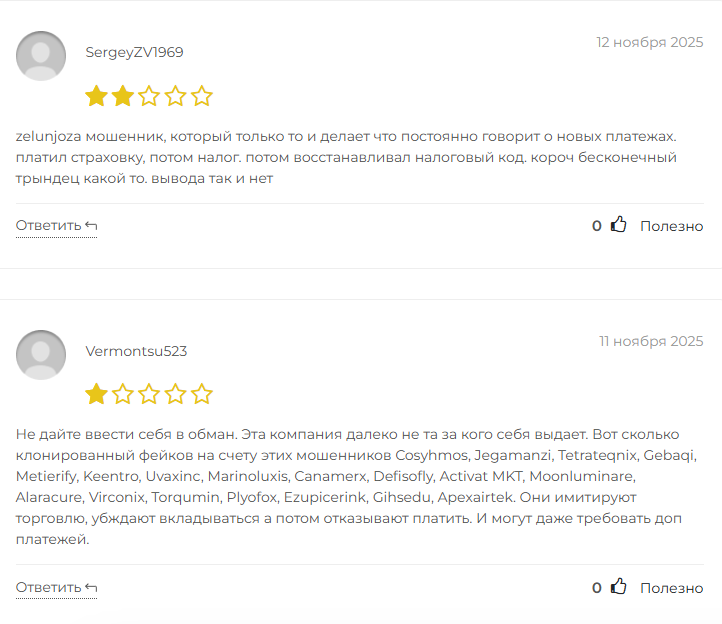 Пользователи предупреждают о фальшивой торговле. Заработать здесь не получается. Брокер только имитирует сделки. Убеждает вкладывать больше. Отзывы о сотрудниках Zelunjoza тоже негативные. Поддержка игнорирует все запросы. В конце отказывает в выплатах под любыми предлогами.