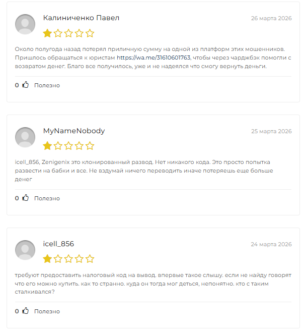 Отзывы о ZeniGenix com легко встретить на нескольких тематических порталах, несмотря на минимальную узнаваемость проекта в целом. Наличие комментариев говорит о том, что кто-то действительно пытался торговать через эту платформу, но их содержание заставляет насторожиться.