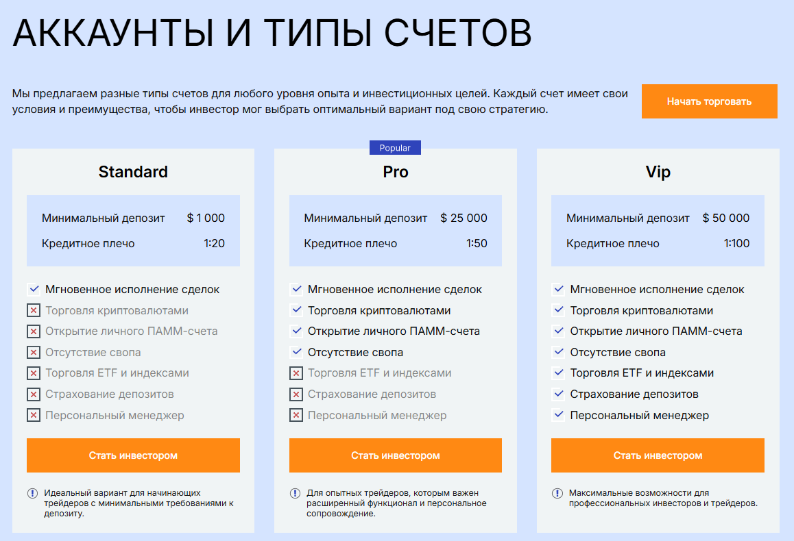 Профессиональный тариф начинается с $25,000, а Vip с $50,000, что позволяет рассчитывать на кредитное плечо от 1 к 50 или 1 к 100, соответственно, а также доступ к рынку криптовалют, личные ПАММ-счета и другие преимущества.