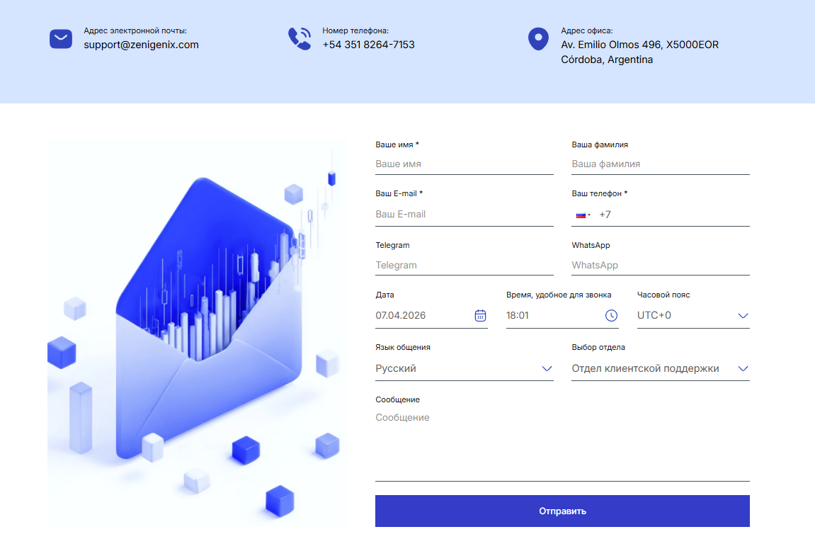Связаться со службой поддержки брокера ZeniGenix com можно, если написать на почту support@zenigenix com или позвонить по номеру горячей линии. Мы попытались дописаться до администрации сайта, но так и не получили никакого ответа, а телефон оказался недействительным.