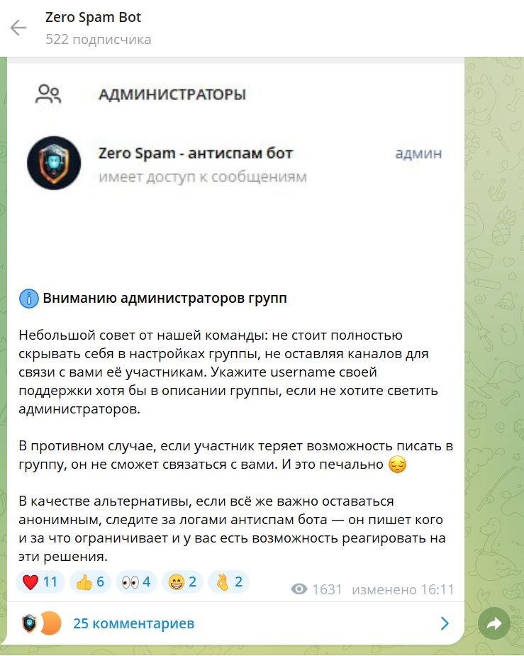 Сотрудничество с проектом Zero Spam Bot выглядит заманчиво, так как многим подобный инструмент действительно может быть полезен, но смущает анонимность владельца и отсутствие подробной информации, поэтому пользоваться ботом следует аккуратно, ведь ему придется предоставить права администратора.