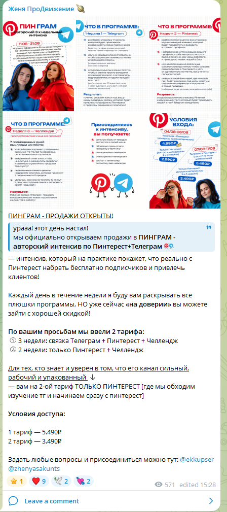 Курс по продвижению в Пинтерест и Телеграм представлен в двух тарифах. Они отличаются по длительности и содержанию: