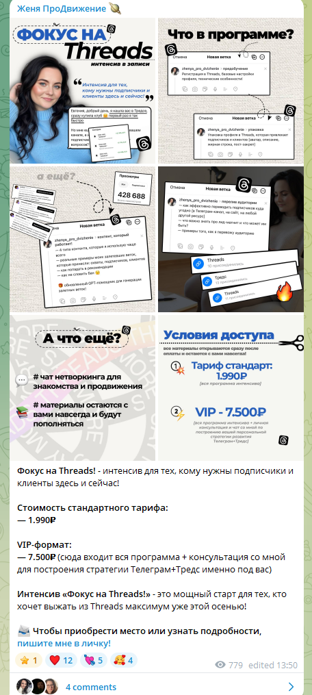Еще автор предлагает обучение. Можно обучиться Threads за 1 990 рублей в записи или за 7 500 в записи + персональной консультацией от гуру.
