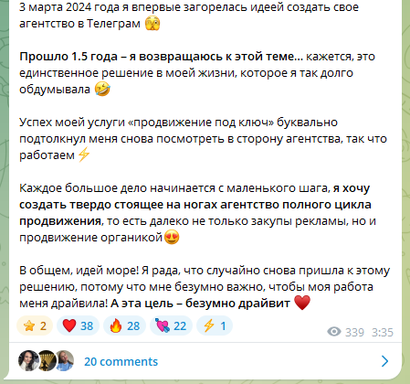 Блогер активно продвигает свои услуги, только вот ее телеграмм канал выглядит сыровато… Комментарии подписчикам оставлять нельзя, информативных постов мало… Не хочу работать с ней, мало доверия к таким специалистам!!!