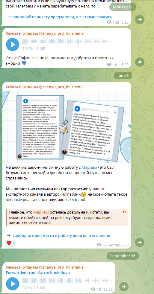 Автор создала отдельный канал, на котором выкладывает свои кейсы и отзывы о работе. Это происходит крайне редко. Записи были в январе 2025 года, июне и сентябре. Вероятно, именно с такой регулярностью ее услугами и пользуются.