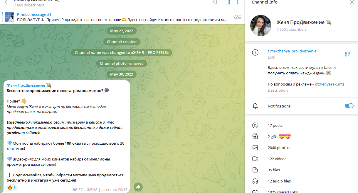Женя ПроДвижение – Телеграм-канал, на котором автор zhenyasakunts рассказывает о том, что зарабатывает на мультиблогинге, создании и монетизации Телеграм-каналов. Она предлагает свои услуги эксперта, а также предлагает пользователям обучение. Проверим работу проекта, чтобы оценить перспективы работы с Женей, обучения у нее.