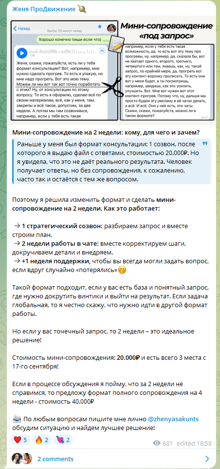 Автор предлагает несколько форматов сотрудничества. У нее можно заказать комплексное сопровождение на 2 или 4 недели. Стоимость услуги составляет 20 или 40 тысяч рублей соответственно.