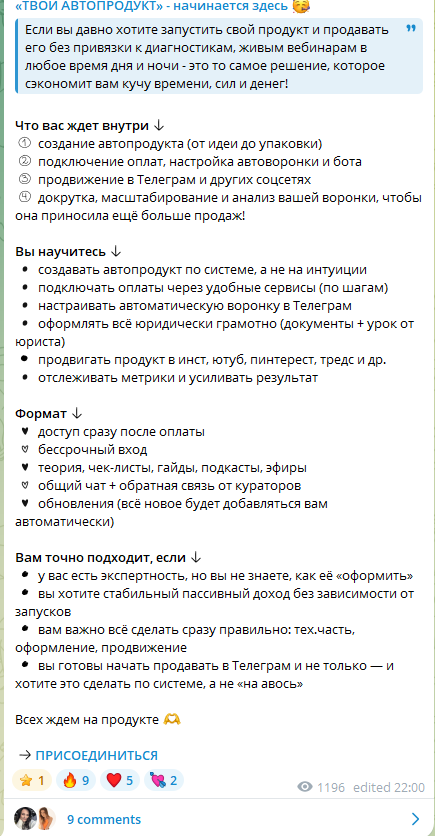 Курс в записи Твой Автопродукт стоит 4 850 рублей. На нем автор обещает научить пользователей создавать автопродукты, подключать и настраивать автоворонки и бота, продвигать свой проект в социальных сетях и масштабировать его.