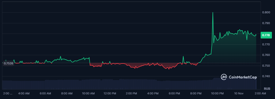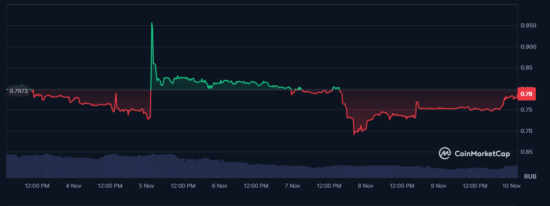 Если посмотреть на движение стоимости в рамках 1 недели, даже 1 дня, то видно, что монета имеет достаточно высокую волатильность. Например, за последнюю неделю она менялась с 69 до 95 копеек за штуку.