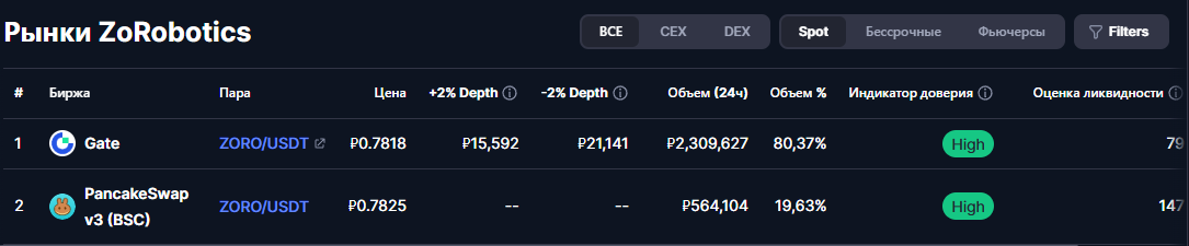 Криптовалюта ZORO – это очень волатильный токен сети ERC-20. В связи с этим им достаточно активно торгуют. Ежедневно выторговывается порядка 30% от всей рыночной капитализации токена. При этом рынков токена немного. Он торгуется только на Панкейке и на Гейте.