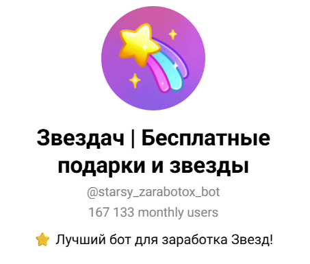 Бот под названием «Звездач Бесплатные Подарки И Звезды» позволяет зарабатывать звезды. Это виртуальные предметы, которые помогут участвовать в конкурсах и лотереях. Также доступен обмен на товары и услуги. Платформа простая в использовании: все команды и инструкции понятные. Там своевременно происходят обновления, что помогает добавлять различные возможности и улучшать действующие. Сам бот простой в использовании: